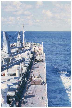 "On the main deck, the faraway hurricane scream of the engine-room intake fans had hushed to a dull drone. The loudest sound came from the fizz of bubbles bursting into the blue, creaming down the ship’s side as the bow wave spread out, flattened and dissolved. The occasional flying fish, alarmed at the threat posed by the sudden arrival of this 600-foot monster, burst from the ripples and glided to safety."