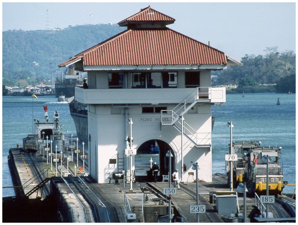 And below is a view of the Pedro Miguel locks that Danny might have enjoyed in daylight (after his adventure) looking towards Miraflores and the Pacific Ocean. (At the right of the picture, the rack-and-pinion railway locomotives are known as "mules".)